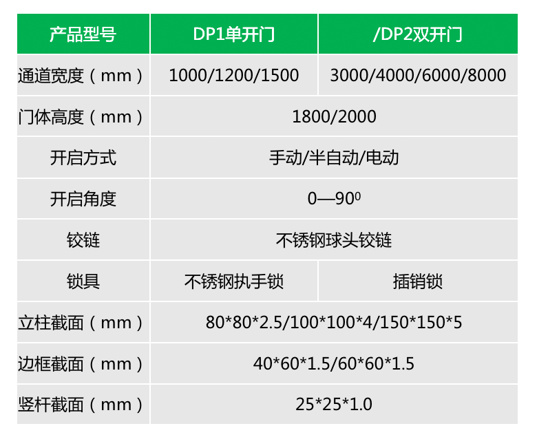 DP1/2单/双扇平开门主要应用于人员通道及消防通道的管理。可实现手动开/关门,也可实现电动开/关门或手动开门闭门器自动闭门。 锁具可根据不同的场景需求选择执手锁、插棍锁、电磁锁等。门轴可选择可调节不锈钢球头铰链及重型门专用闭门铰链等。