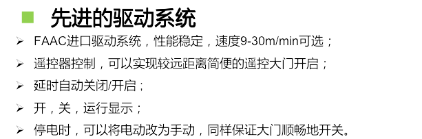 DG1轨道平移门融合行业领先的工业设计和制造技术;高强度高耐腐锰钢基材底梁,有轨运行设计,国际一流品质的平移门专用电机和丰富的控制系统, 多重防腐工艺和高附着力聚脂粉末涂层等技术。在环保理念、美学效果、结构设计、安全概念以及超长使用寿命上领先于国内业界平移门产品