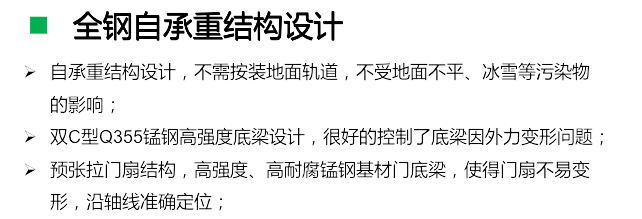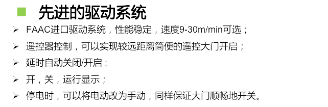 DW无轨悬臂门融合行业领先的工业设计和制造技术;高强度高耐腐锰钢基材底梁,无轨运行设计,国际一流品质的平移门专用电机和丰富的控制系统, 多重防腐工艺和高附着力聚脂粉末涂层等技术。在环保理念、美学效果、结构设计、安全概念以及超长使用寿命上领先于国内业界平移门产品