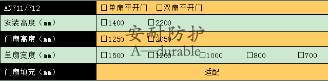 AN711/AN712平开门为机械式平开门,有单扇平开(AN711)和双扇平开(AN712)两种款式,门扇以网片填充,门扇带有边框,门柱为矩形金属