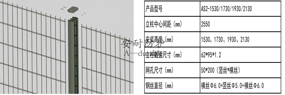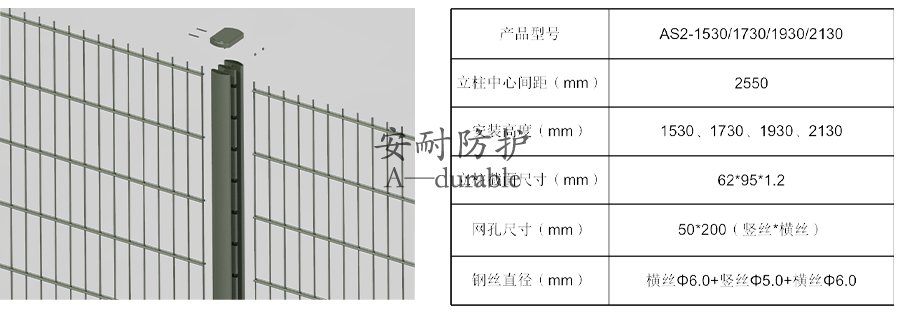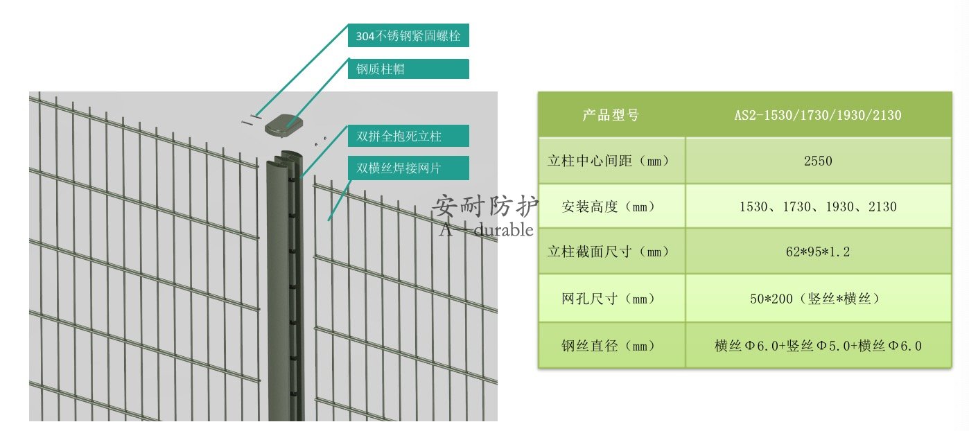 AS2双横丝焊接网围栏由一次成型无焊缝全钢双拼立柱和双横丝焊接片网组成;立柱铰链式扣拉槽结构和片网连接,无需连接件;围栏外观简约通透,周界内外视觉